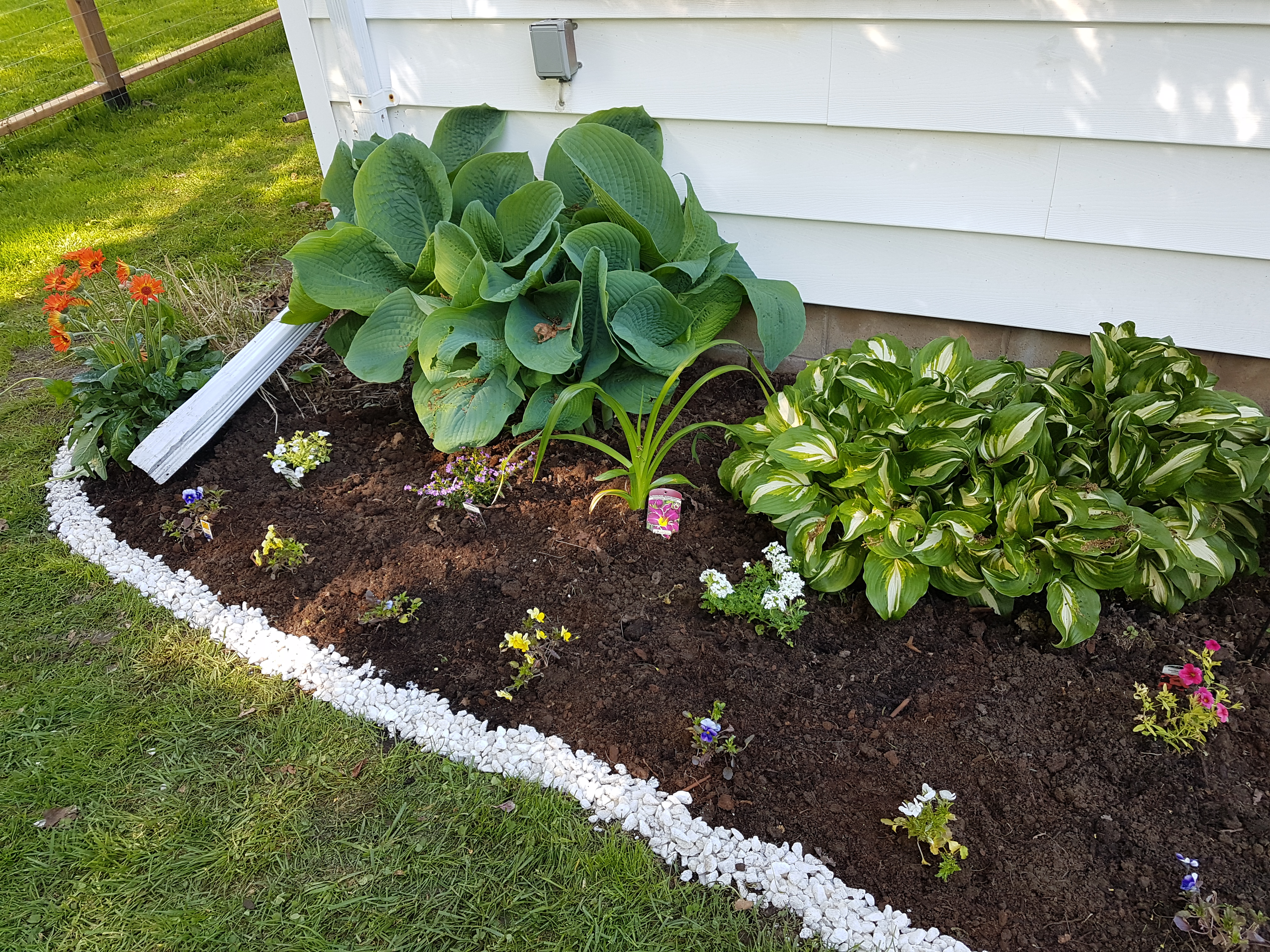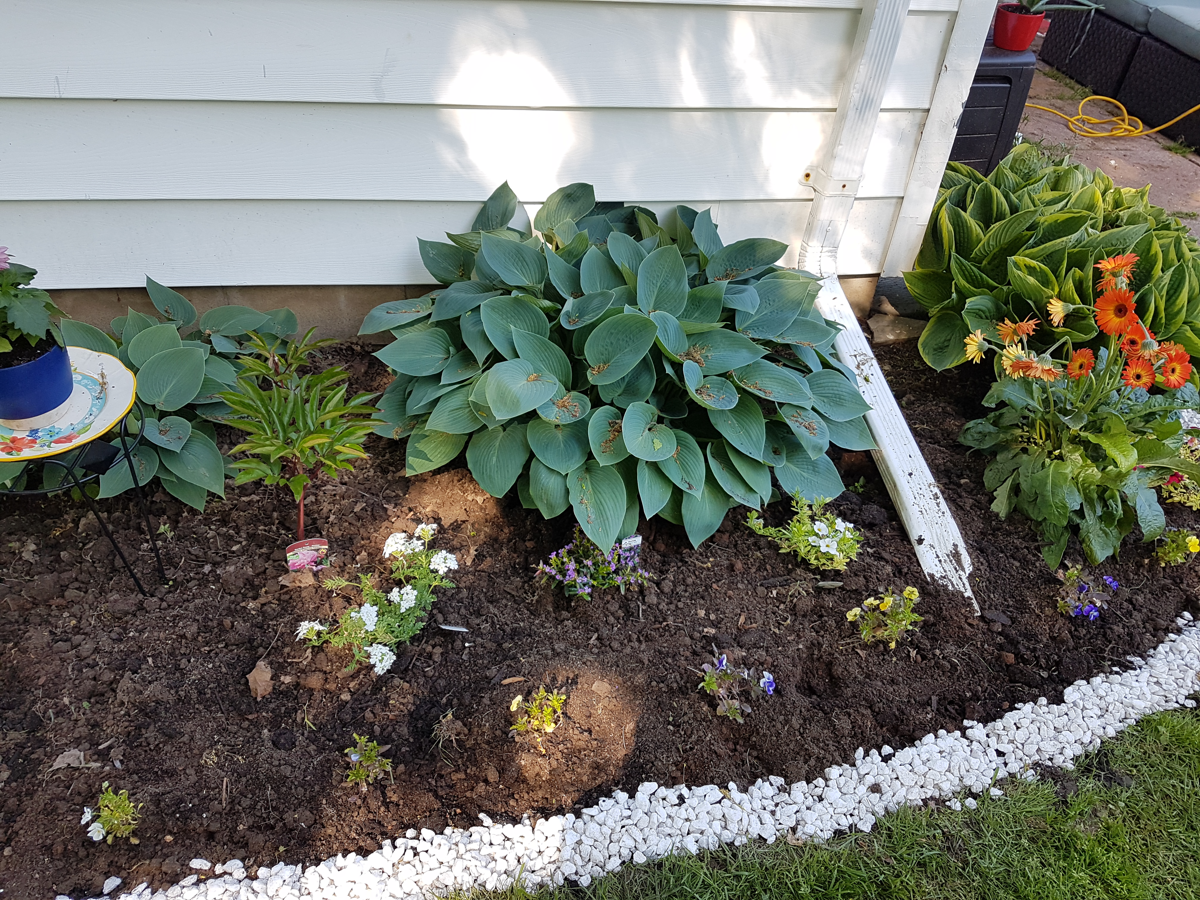 As spring progressed, I also realized there were no prenneials except hostas in my garden. I ended up buying and planting some annuals and perennials for my gardens. I also bought some herbs to help keep the bugs away from the sitting area.